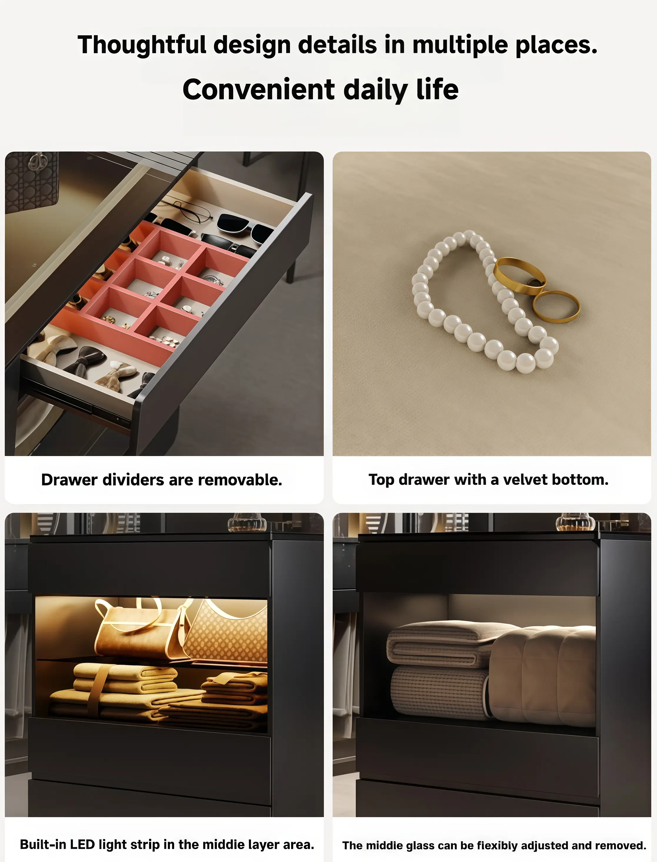 Middle & Lower Storage: The middle section features an open storage area, ideal for oversized accessories like handbags or seasonal linens. Its removable shelves allow vertical adjustments to suit your evolving needs. Below, the lower level houses deep, easy-access drawers designed to expand storage capacity for clothing, bedding, or daily essentials. This isn’t just a jewelry case—it’s a holistic storage solution that adapts to your lifestyle.