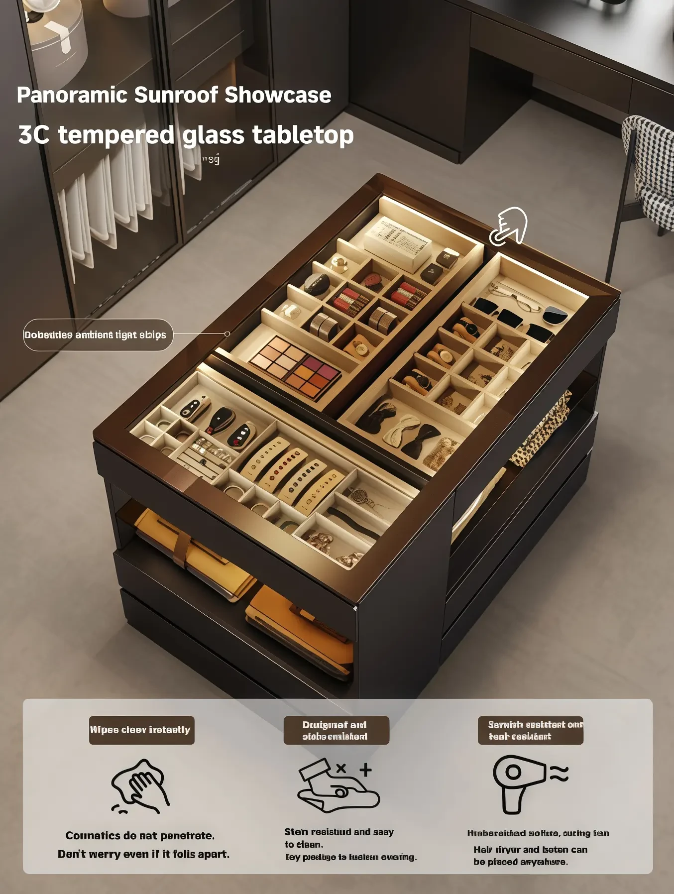 Luxury Glass-Top Jewelry Display Case:Elevate your jewelry collection and living space with this exquisite display case, designed to blend sophistication, functionality, and timeless elegance. Crafted with meticulous attention to detail, it transforms storage into an art form while offering unparalleled versatility.