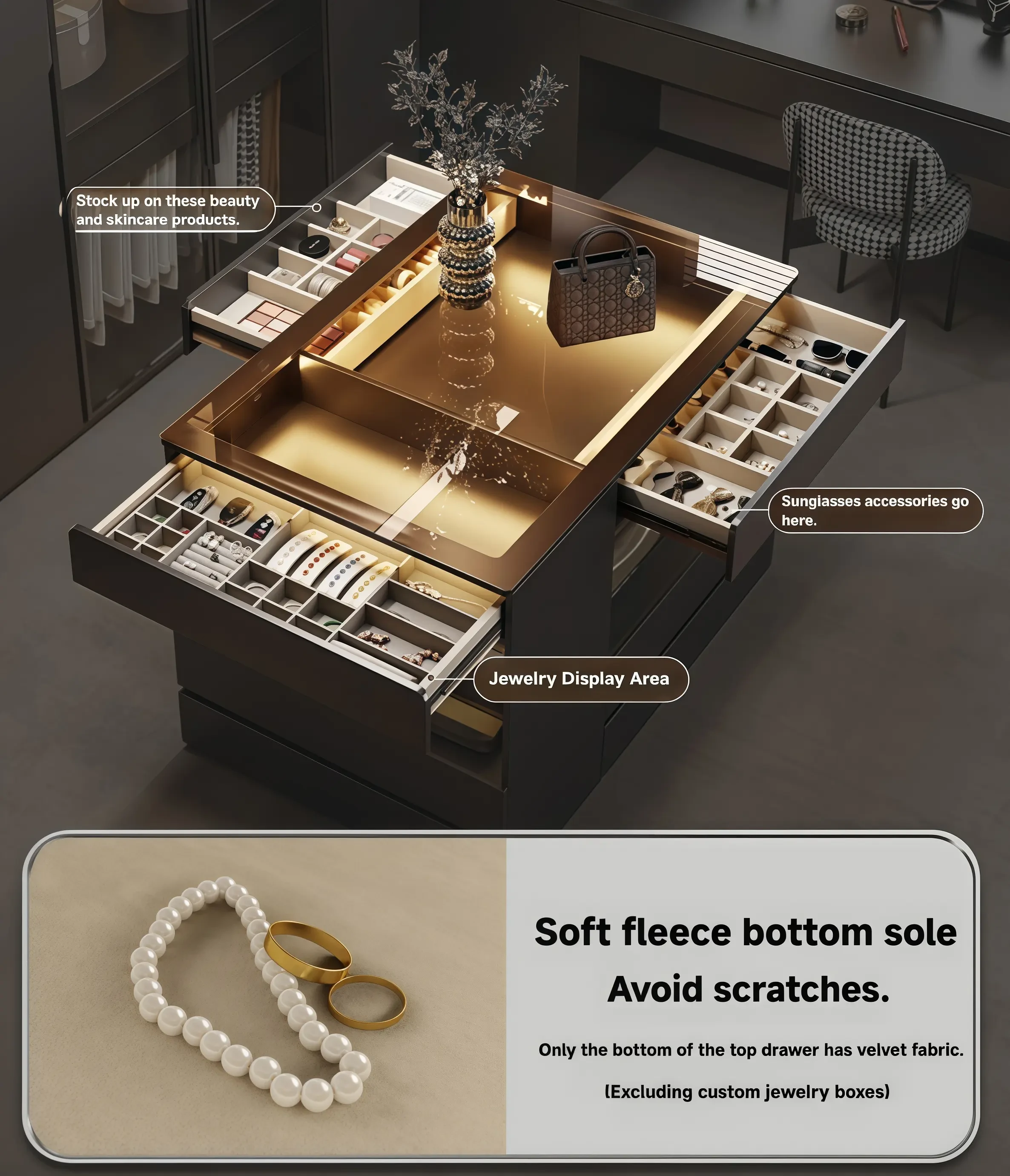 Upper Storage: The upper tier introduces a multi-layer drawer system tailored for jewelry enthusiasts. Each drawer is lined with sumptuous velvet, creating a plush backdrop for rings, necklaces, and bracelets. Removable and adjustable dividers let you personalize the layout, ensuring every item has its designated space. Whether you’re organizing heirlooms or everyday pieces, this system combines luxury with precision.