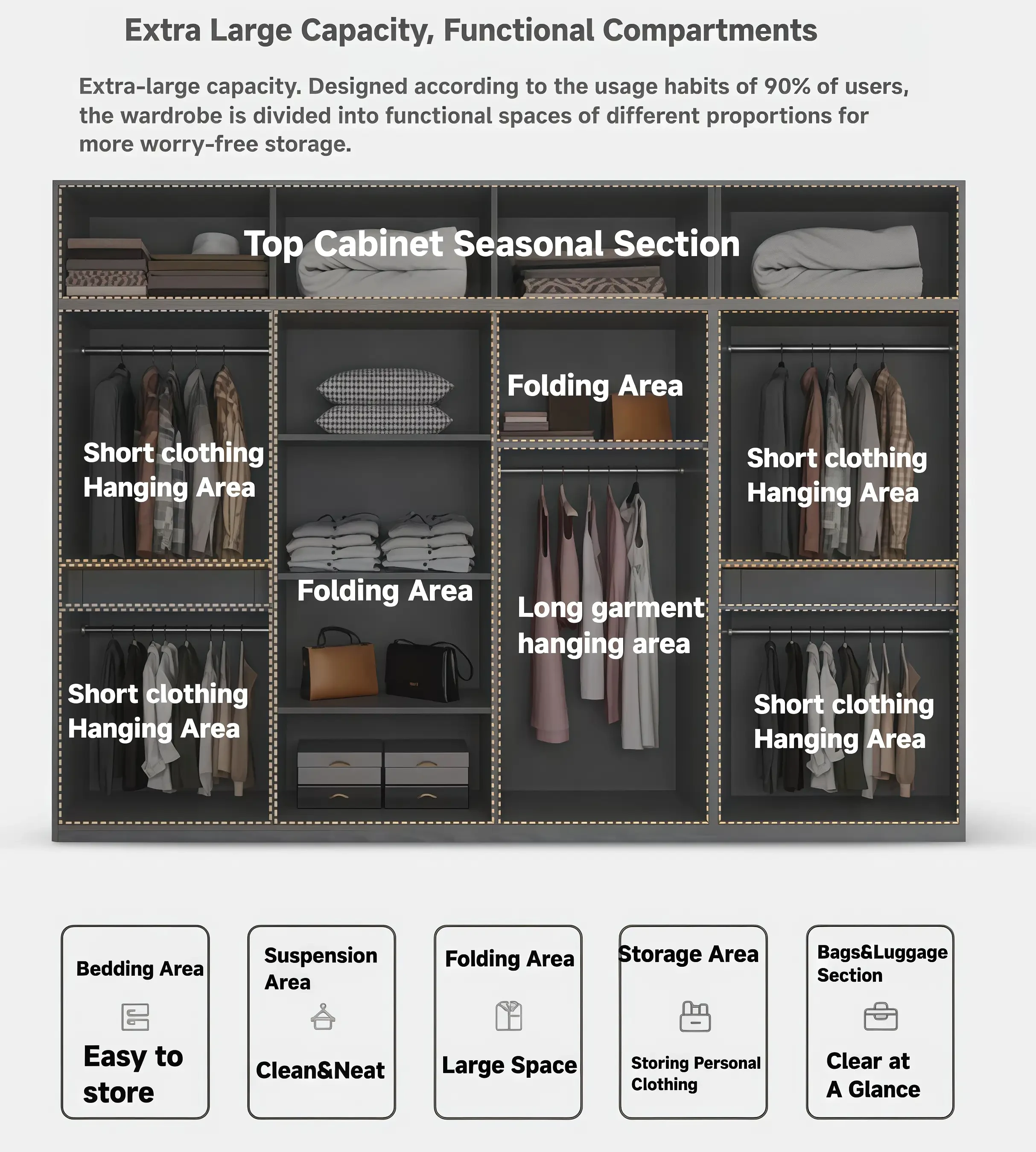 Spacious & Smartly Organized Storage: Features a large-capacity interior with optimized functional partitions designed for 90% of users. Dedicated zones include a bedding area, short-hanging section, and folding space, making clothing storage effortless and efficient