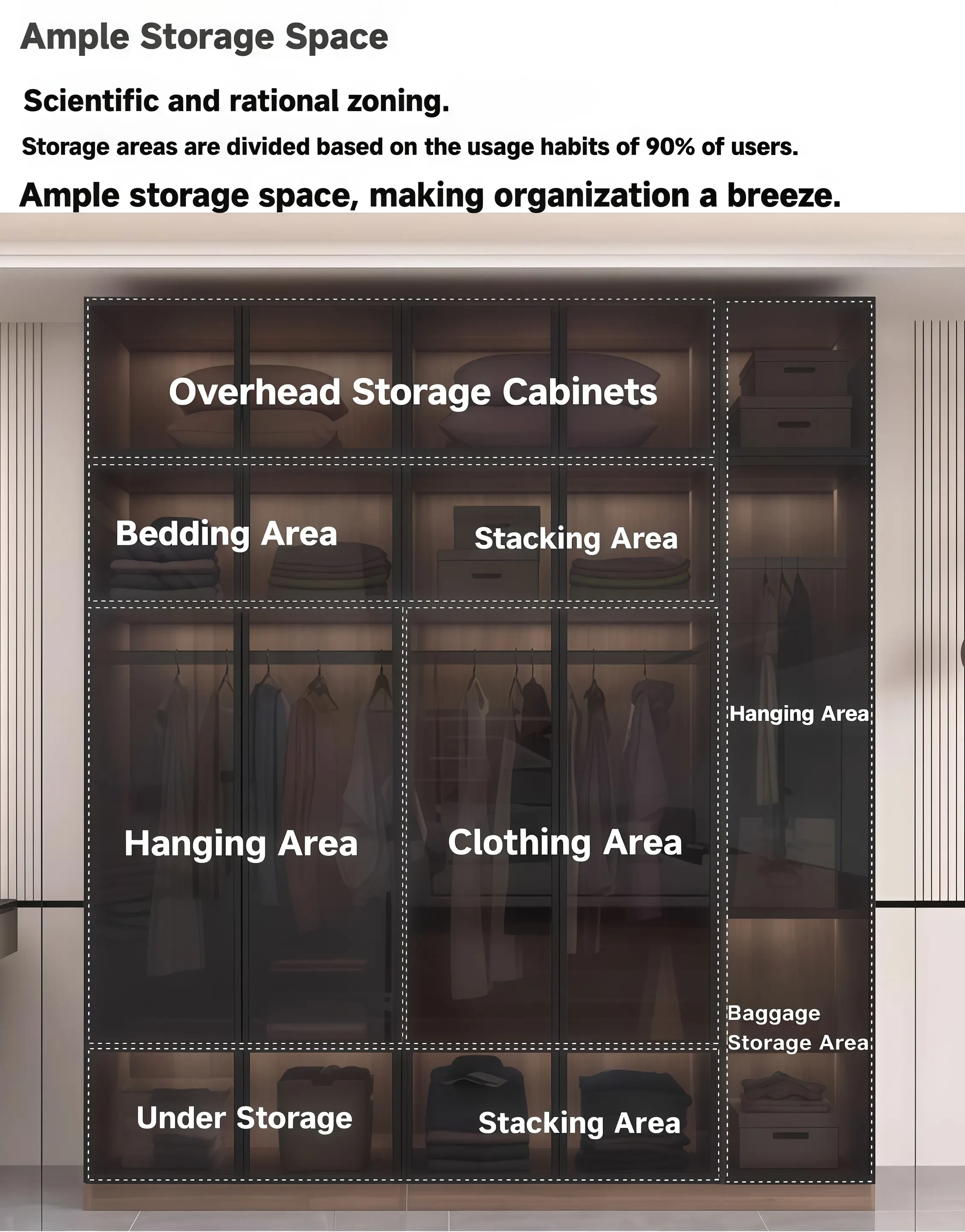 Optimized & Ample Storage:Offers generous, intelligently organized space with dedicated zones for hanging clothes, storing bedding, and folded items, tailored to user habits for effortless organization and maximum capacity